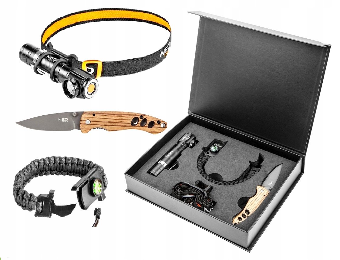 NEO TOOLS, Set 3 elementy (latarka czołowa 99-026, bransoletka survivalowa 5 w 1 63-140, nóż składany), 63-033 - 99,99 zł (-28%) | BudoPromki